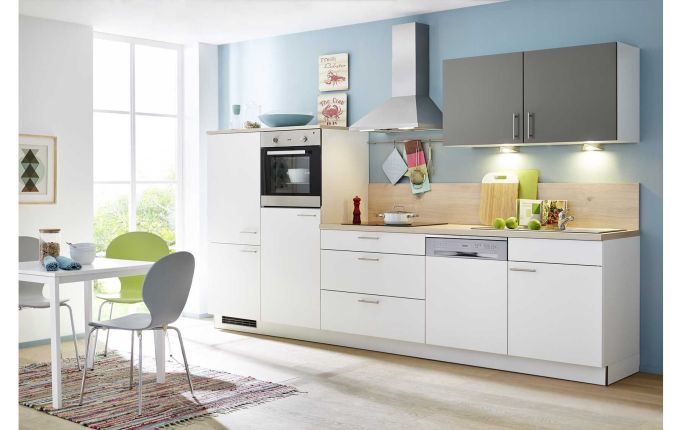 Diese Küchenzeile besticht durch Ihre moderne, klare Linie. Klassisches Weiß trifft auf die moderne Farbe Quarzgrau und setzt somit einen eleganten Akzentpunkt. Diese Küchenzeile überzeugt als wahres Raumwunder, hier wurde alles untergebracht, um eine funktionelle und stets aufgeräumte Küche zu haben. Durch die nach links versetzten Hochschränke ergibt sich ein Freiraum, welcher sich nach Ihren Wünschen dekorieren lässt. Viel Platz bieten Ihnen die großzügigen Auszüge unter dem Kochfeld. Um Ihnen ein ergonomisches Kochen zu ermöglichen, befindet sich der Backofen auf angenehmer Rückenhöhe. Sämtliche Elektrogeräte runden das Gesamtpaket dieser Traumküche ab.Mehr Informationen