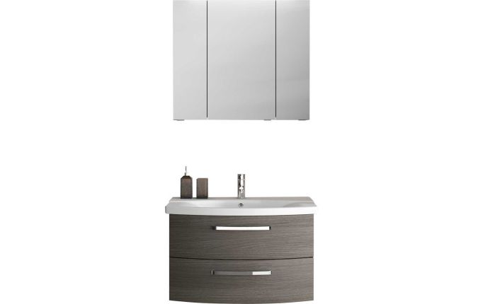 - Bestehend aus: 1x Spiegelschrank mit 3 Drehtüren, einfach verspiegelt, 6 Glaseinlegeböden, Schalter/Steckdose, B/H/T: ca. 80/70,3/17 cm; 1x LED-Aufsatzleuchte, B: ca. 60 cm; 1x Keramikwaschtisch in weiß mit Armaturbohrung und integriertem Überlauf, B/H/T: ca. 84/4,5/45 cm; 1x Waschtischunterschrank mit 2 Auszügen, B/H/T: ca. 80/49/46 cm