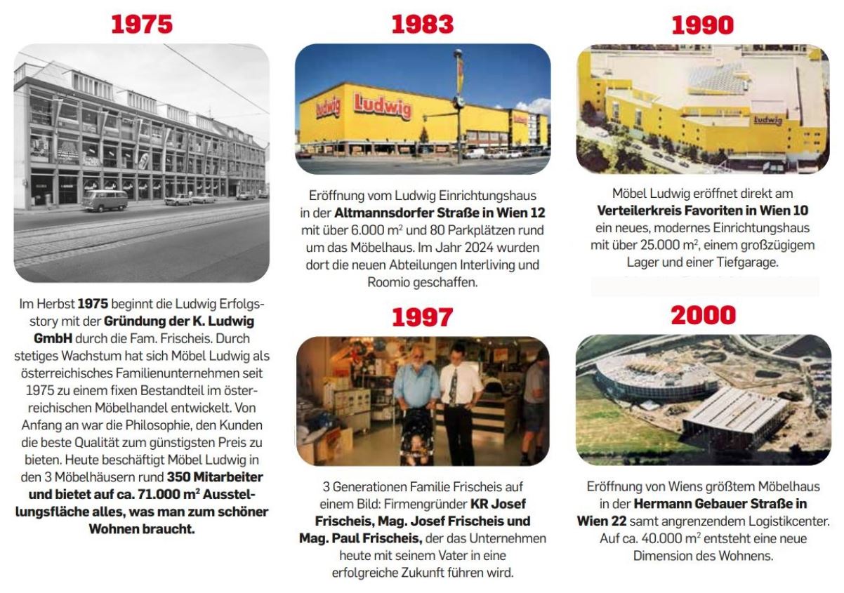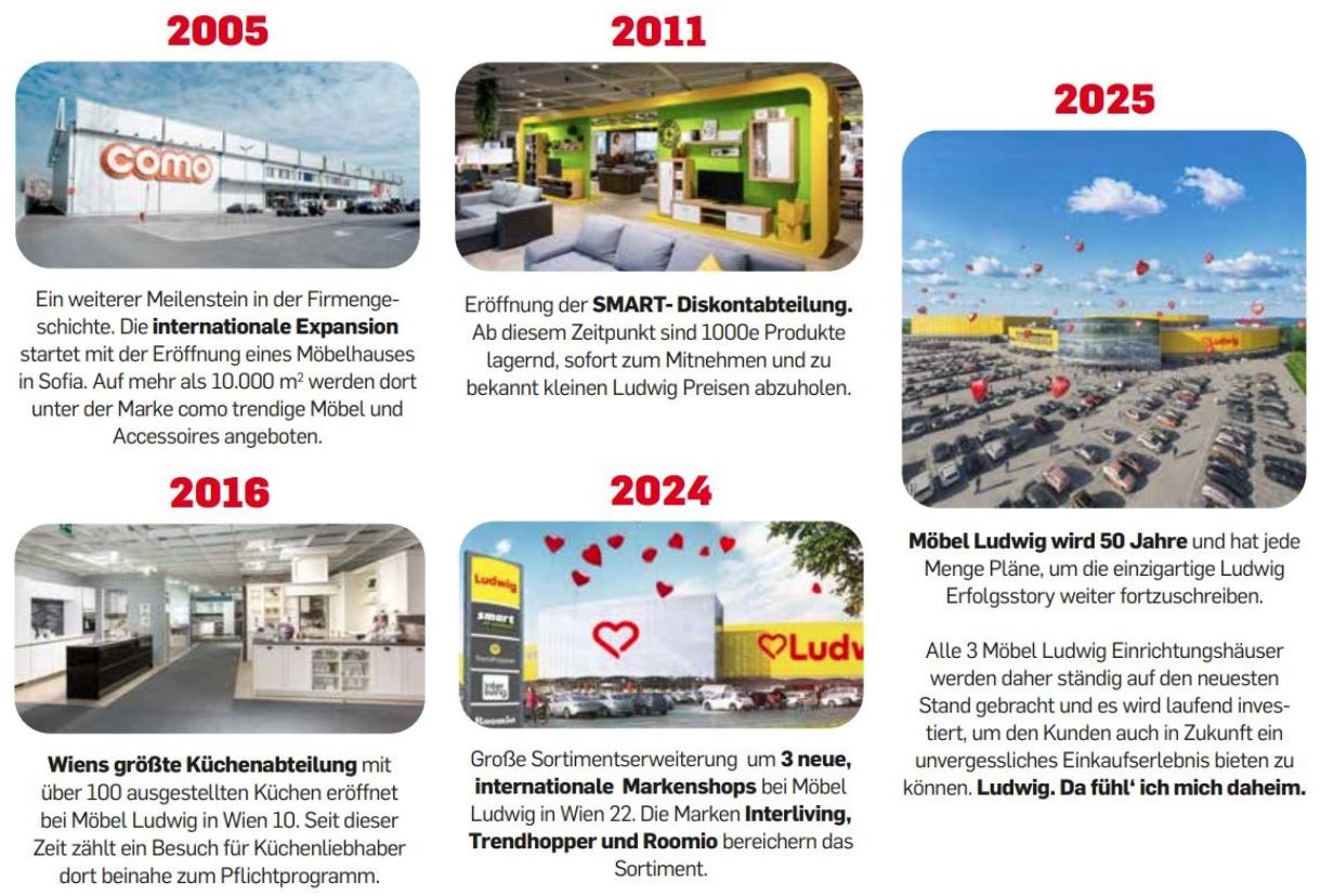 Im Laufe der Jahre hat sich Möbel Ludwig, dank eben dieser Kundenorientiertheit, zum größten Möbelhaus Wiens entwickelt und ist an drei Standorten in Wien, sowie auch in Bulgariens Hauptstadt Sofia, vertreten. Diese Standorte bieten dem Kunden aber nicht nur eine riesige Auswahl an Möbeln, sondern mehr als das, dem Kunden soll ein Erlebnis geboten werden. Individualisierte Beratungen, Restaurants und Events sind für Möbel Ludwig ein Standard der aus einem essenzielen Grundsatz entspringt: „Der Kunde ist König!“